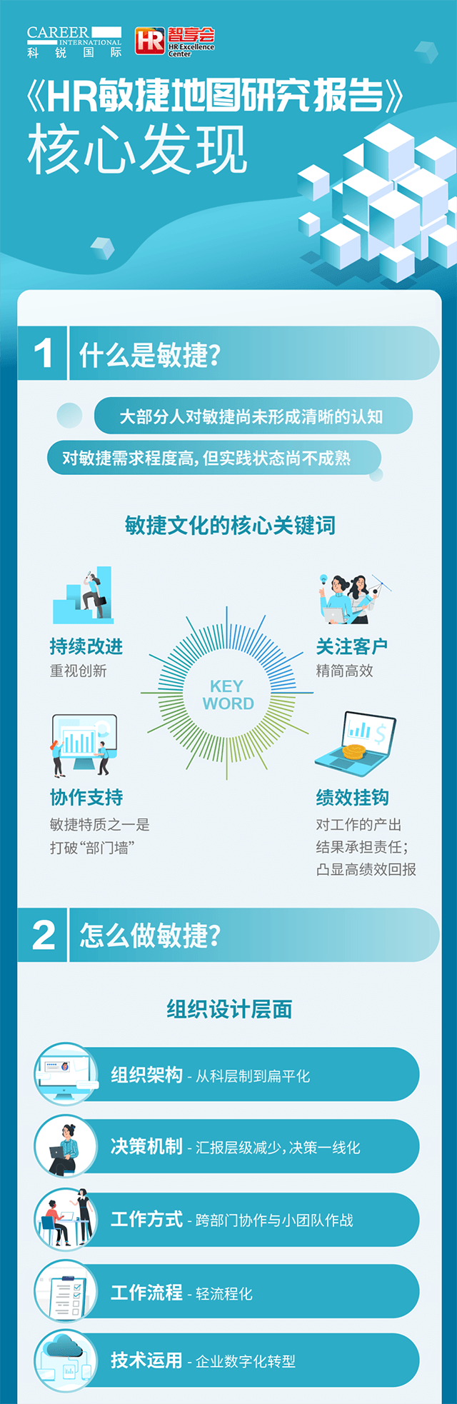 对于组织而言,有哪些工作方式、要素帮助组织敏捷起来?为了更好地助力组织的敏捷,人力资源团队做了哪些调整?为了探究以上问题,凯发K8国际国际人力资源公司联合智享会发起了“HR 敏捷地图”调研研究。问卷调研了三百余家企业,分析现在企业对“敏捷”概念的认知,和组织敏捷的现状。顺利获得深度采访十余位大型企业的人力资源一把手,探究组织敏捷实践场景以及人力资源在其中的助力之处,以及为了更好地助力组织敏捷人力资源团队自身在架构、能力等方面的调整。